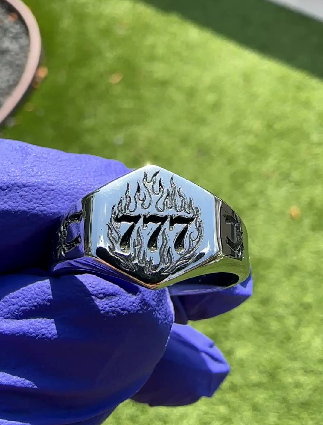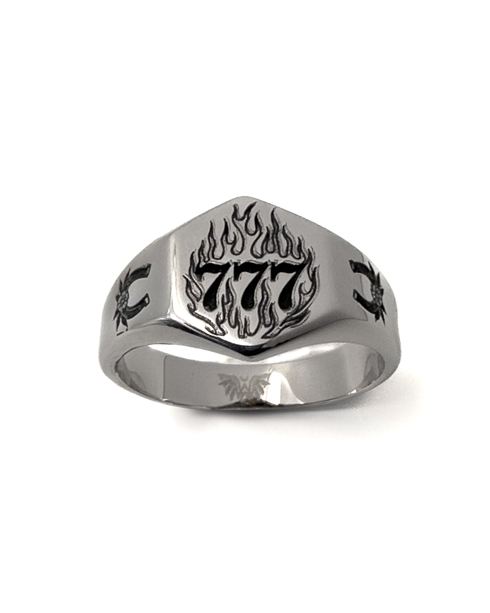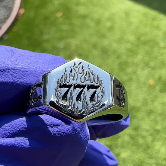 Lucky features flaming 777s engraved front and center—an angel number tied to fortune, timing, and divine alignment. Twin tattoo-style horseshoes ride the sides, bringing in classic luck with a Western twist. Whether you believe in signs or just like stacking odds in your favor, this ring’s made for the ones who bet on themselves.