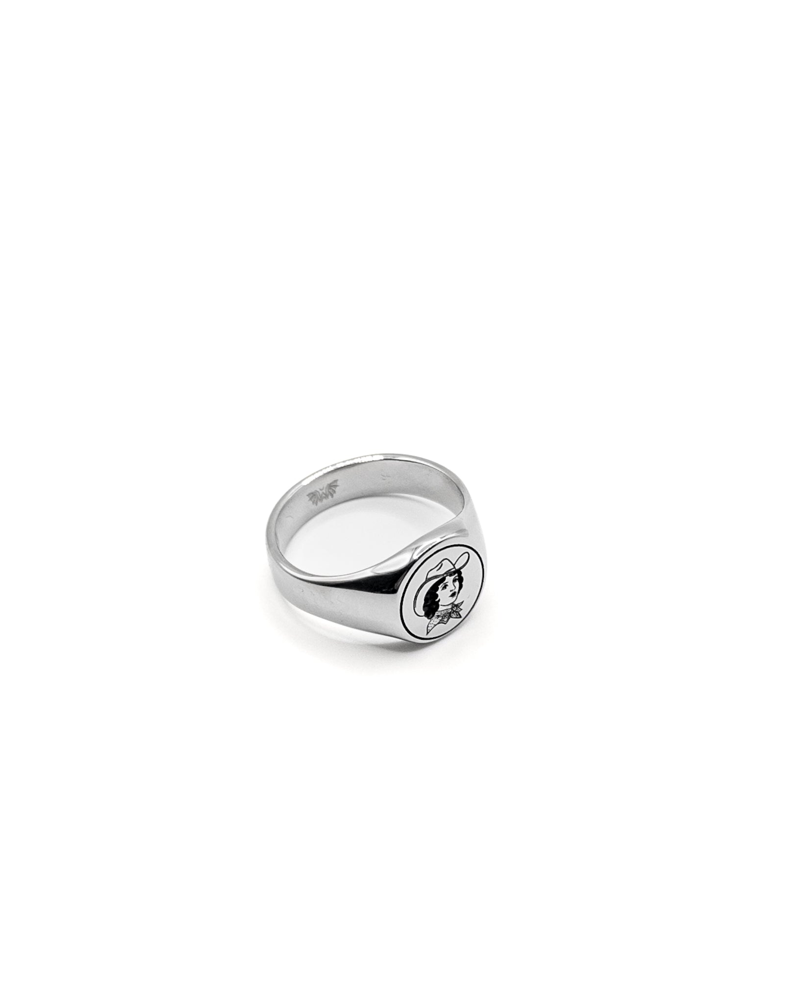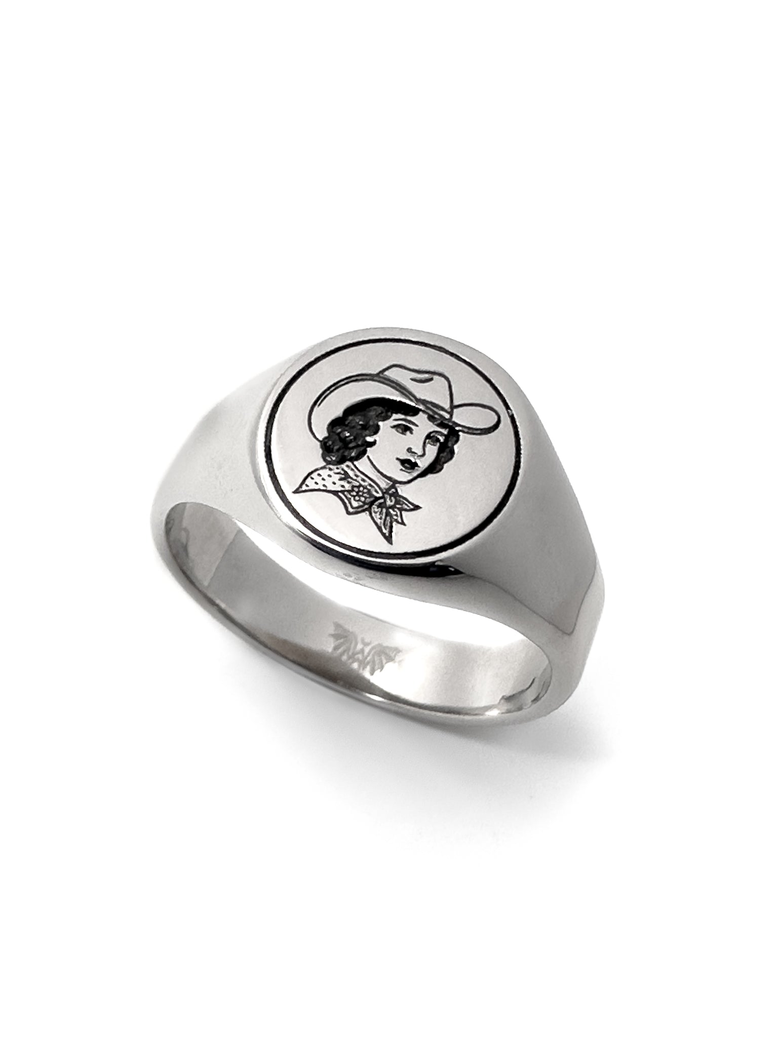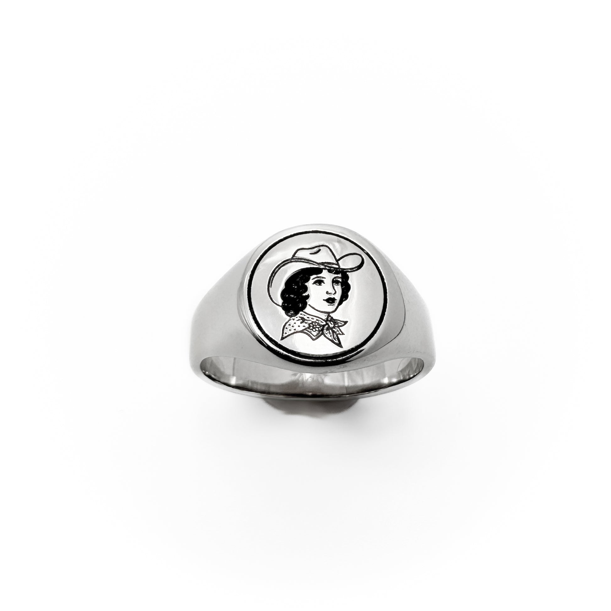 Bonnie features an engraved cowgirl in classic American traditional tattoo style, framed on a polished round signet face. Named after the kind of girl who’d rob your heart... or your bank.
