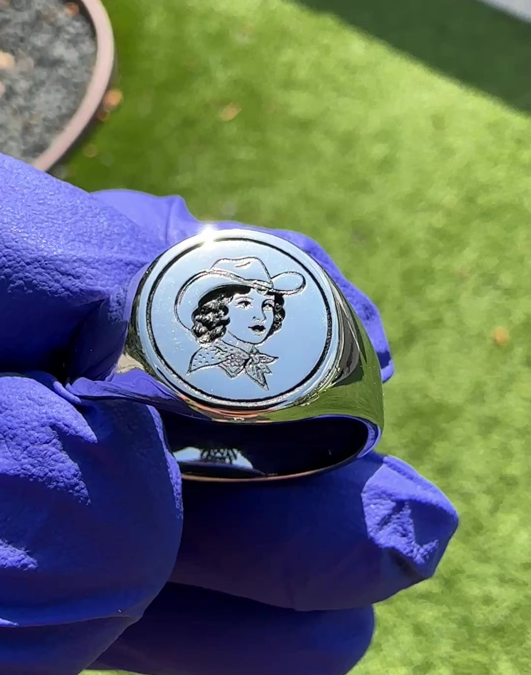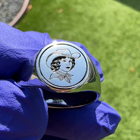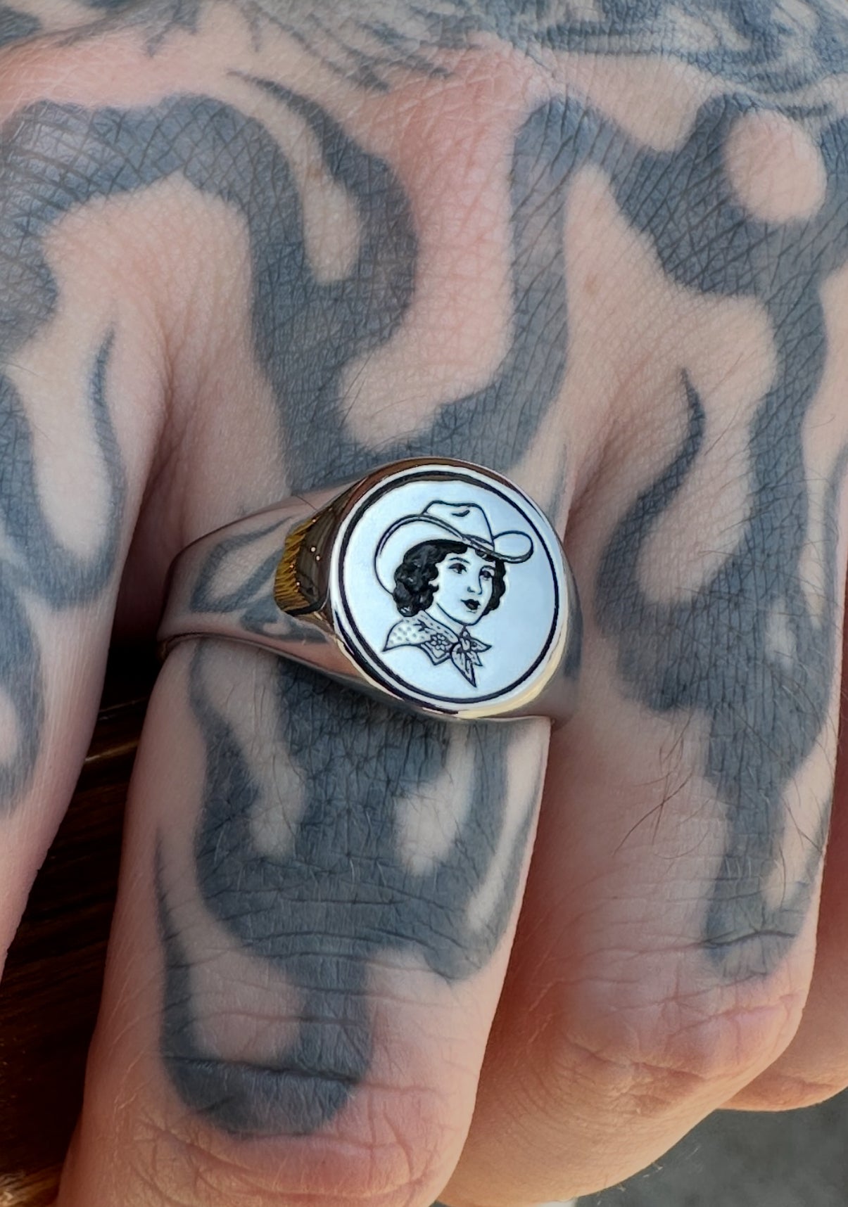 Bonnie features an engraved cowgirl in classic American traditional tattoo style, framed on a polished round signet face. Named after the kind of girl who’d rob your heart... or your bank.